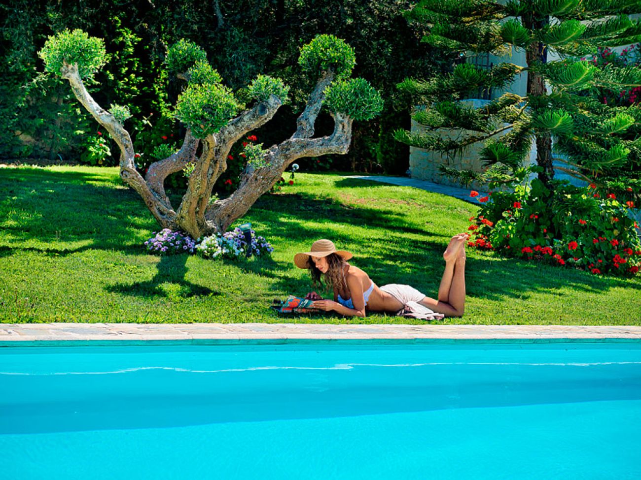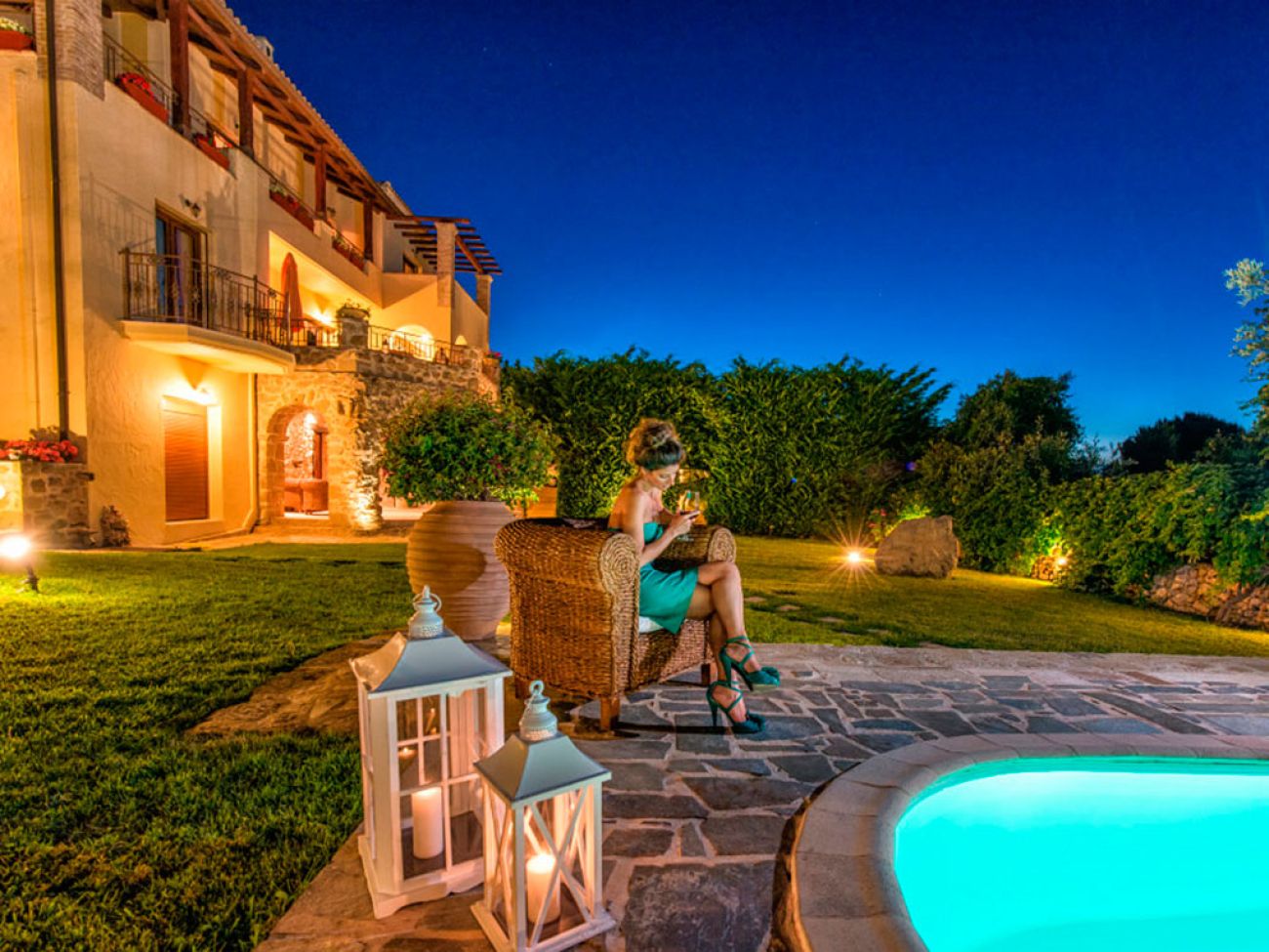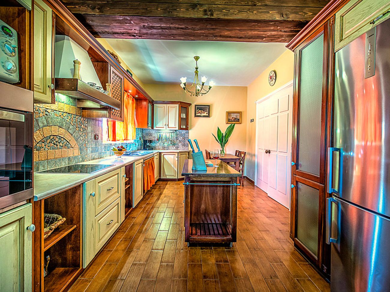 Вилата разполага с просторен хол с камина и стълбище, което води до по- луксозна трапезария , с изглед към Йонийско море. Наблизо има напълно оборудвана кухня, направена в традиционния стил . Вилата е оборудвана с централно отопление за всеки етаж , снабдена с климатик , гараж, складово помещение с пералня и сушилня, както и алармена система .