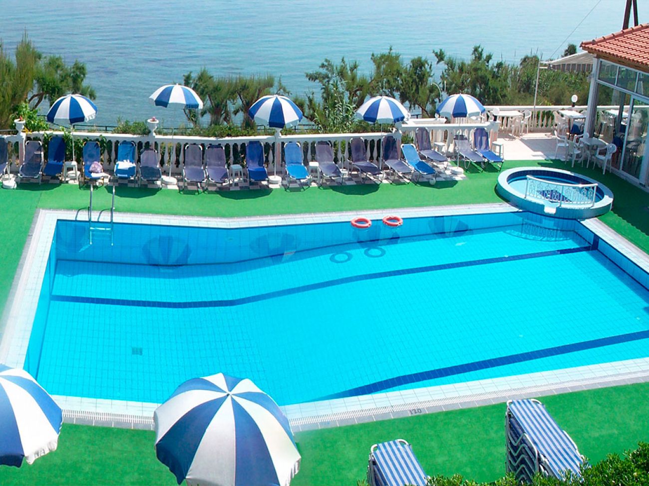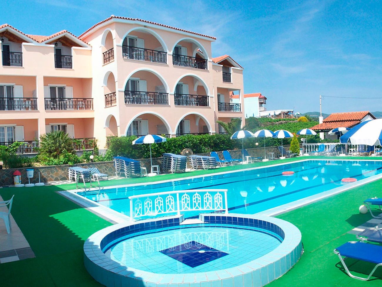 Поддържана зелена територия, басейн, директен достъп до плажа, просторни стаи с кухненски бокс, ресторант, бар, интернет достъп и качествено обслужване.