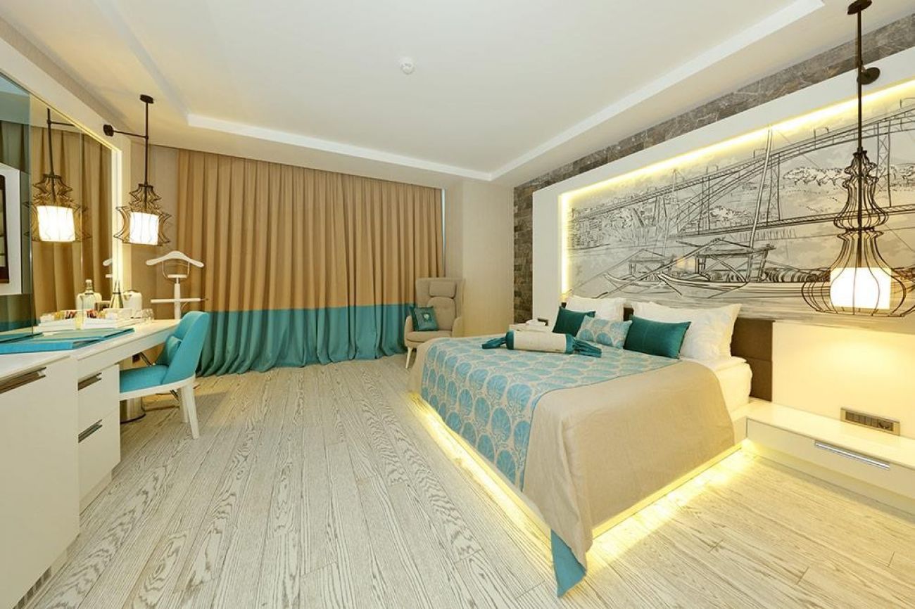 В стаите: Хотелът разполага с общо 426 стаи, с изглед към морето, голф игрището и градината в една основната 6-етажна сграда с 10 асансьора. Стаите са оборудвани с централен климатик, мини бар (2 бутилки бира, студен чай – 2 бутилки, Fanta, Sprite – по 2 бутилки, мин. вода - 2 бутилки, плодов сок, диетична Coca Cola; чипс, бисквити, ядки, шоколад, червено и бяло вино ( 18.75 cl), ежедневно попълване), сет за чай и кафе, плодова чиния при пристигане, LCD телевизор, музикални канали, телефон с директно избиране, Wi-Fi (безплатно), вана душ, сешоар, халат и чехли за възрастни и деца, балкон (с изключение на вила Sueno Island), електронен сейф (безплатно), детско легло (при поискване), меню за възглавници, под - ламинат, килими.