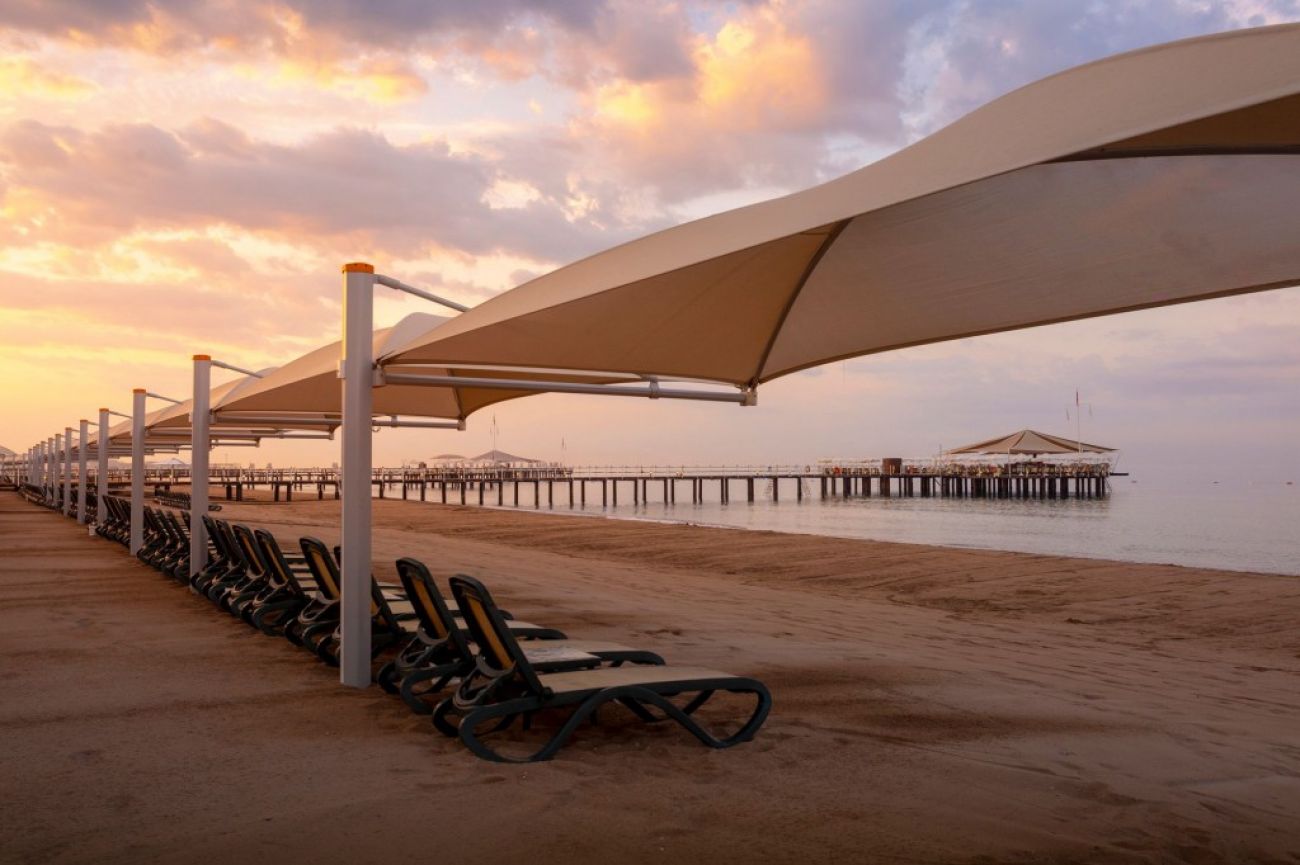 Плаж: Собствен, пясъчен с дължина 250 м. Чадъри, шезлонги и матраци на плажа и при басейна – безплатно, плажни кърпи – безплатно,Бар на плажа. Голям пирс. Плажни кърпи-безплатно. Шатри на плажа-платено.