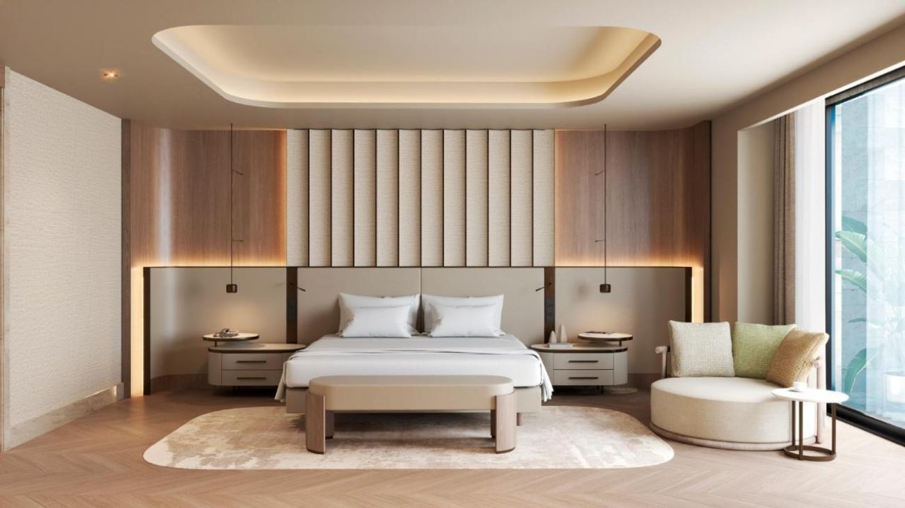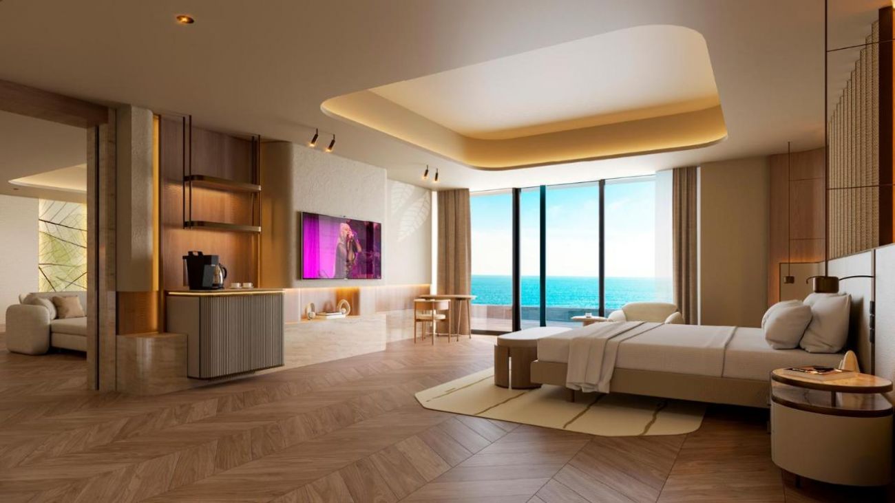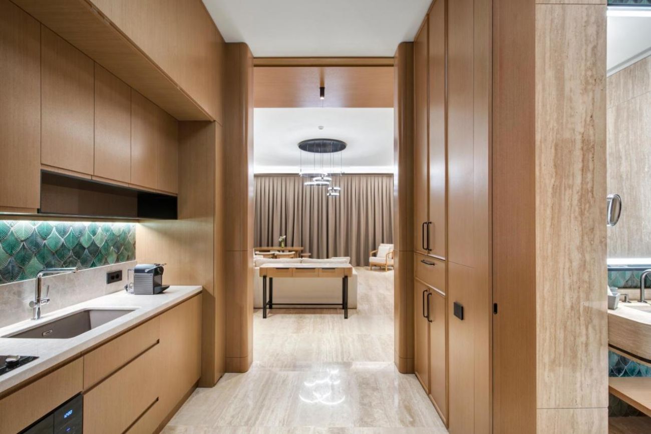 Апартаменти Main Building – Seascape Escape (1 спалня, 1 всекидневна, гледка море – 110 м2), Family Suite (2 спални, изглед градина – 125 м2), Grand Family Suite (2 спални, кухненски бокс, всекидневна, изглед градина – 185 м2), Panoramic Suite (1 спалня, кухненски бокс, всекидневна, изглед море – 215 м2), Horizon Suite (2 спални, кухненски бокс, всекидневна, изглед море – 200 м2), Crown Horizon Suite (3 спални, кухненски бокс, всекидневна, изглед море – 450 м2), Crown Signature Suite (5 спални, кухненски бокс, всекидневна, СПА зона, изглед море – 1700 м2), Amber Lagoon Suite (1 спалня, 1 всекидневна, изглед градина и директен достъп до общ басейн – 90 м2), Amber Lagoon Villa (2 спални, кухненски бокс, всекидневна, изглед градина и директен достъп до общ басейн – 155 м2)