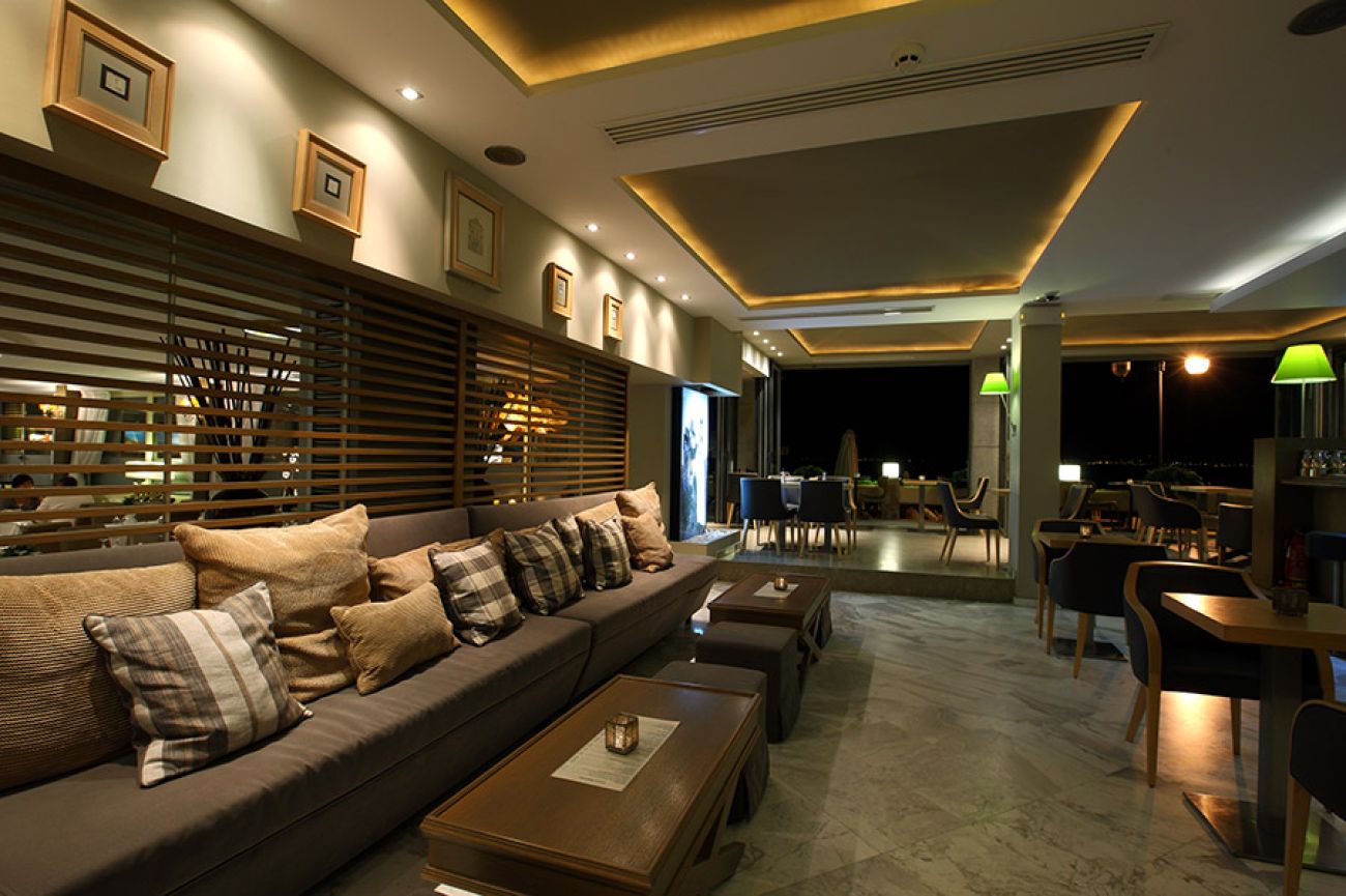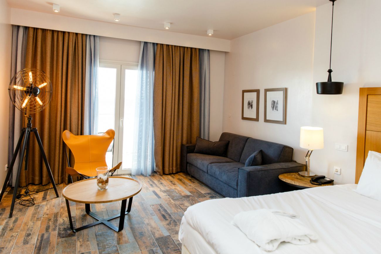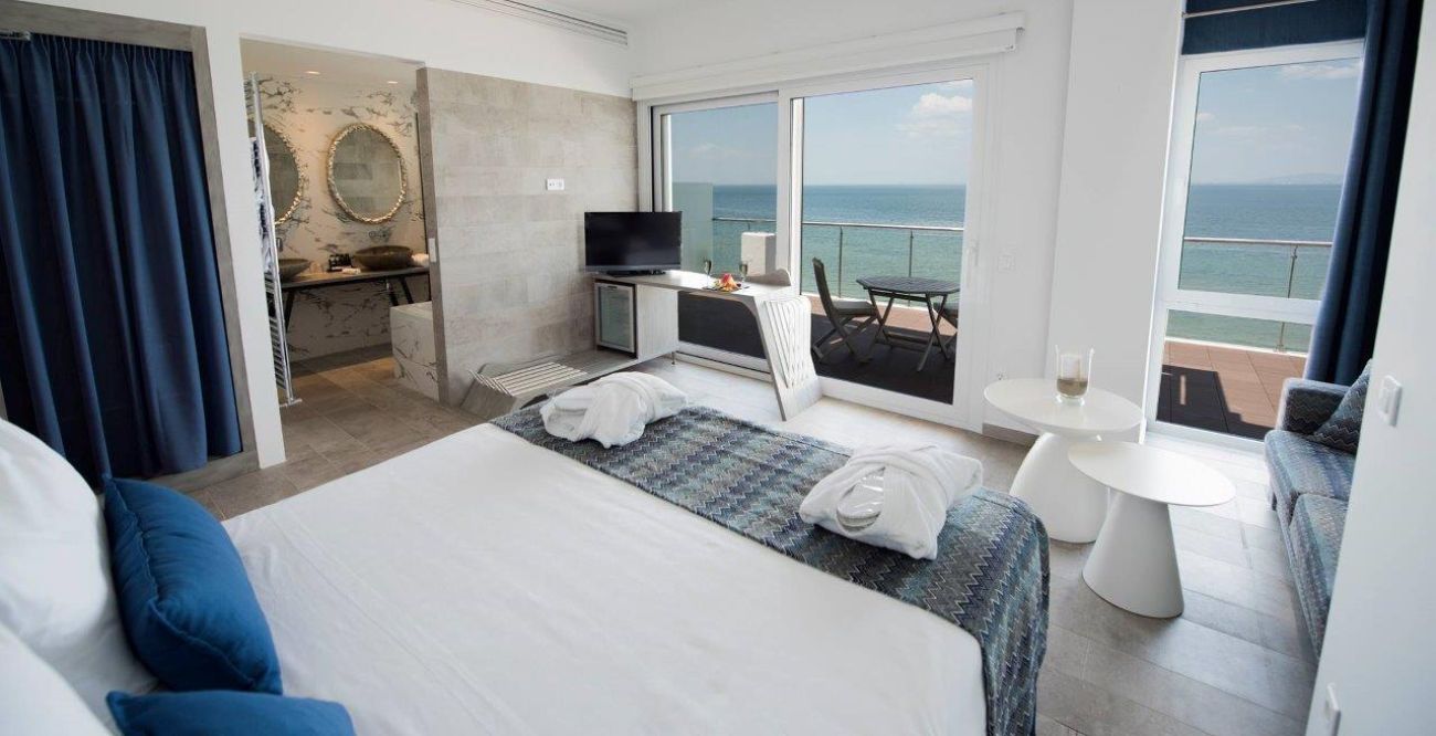 Junior Suite Изглед към морето. Всекодневна зона с два дивана, декоративно отделена от двойно легло, анатомични матраци Coco-Mat, хладилник, халаты, телевизор LED, баня с вана, комплект луксозни козметични принадлежности, халати, безплатен паркинг към хотела.
