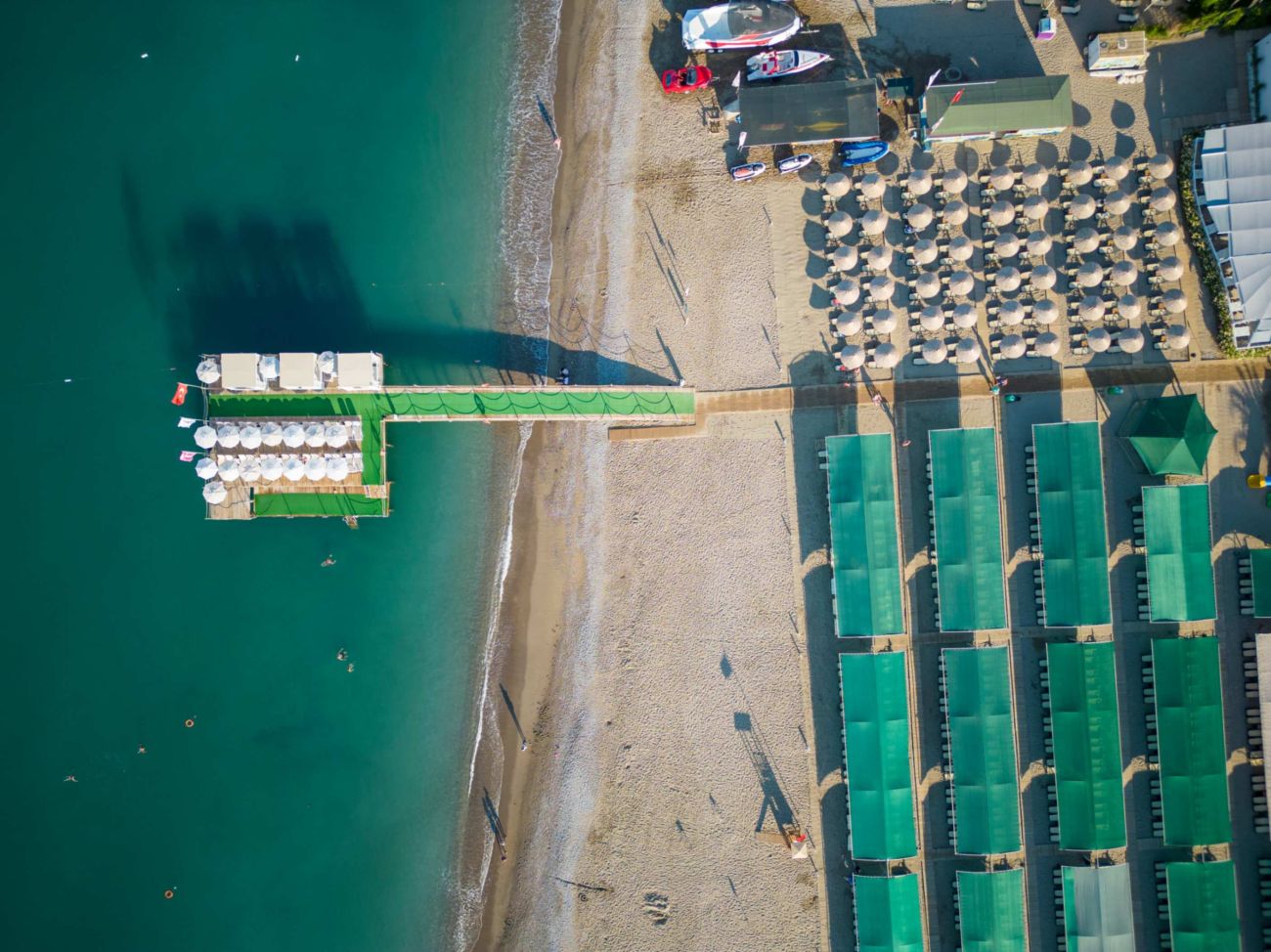 Собствен, пясъчно - чакълест. Чадъри, шезлонги и плажни кърпи на плажа и при басейна - безплатно.