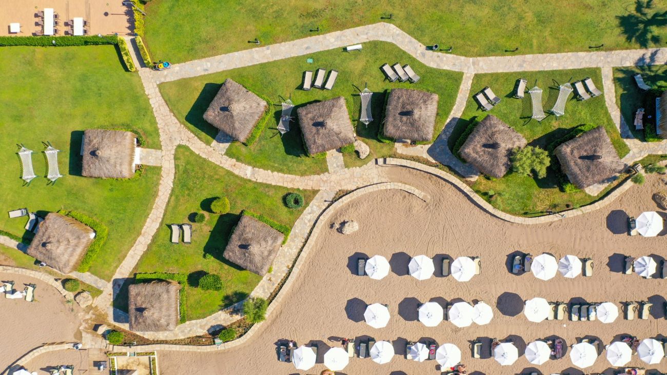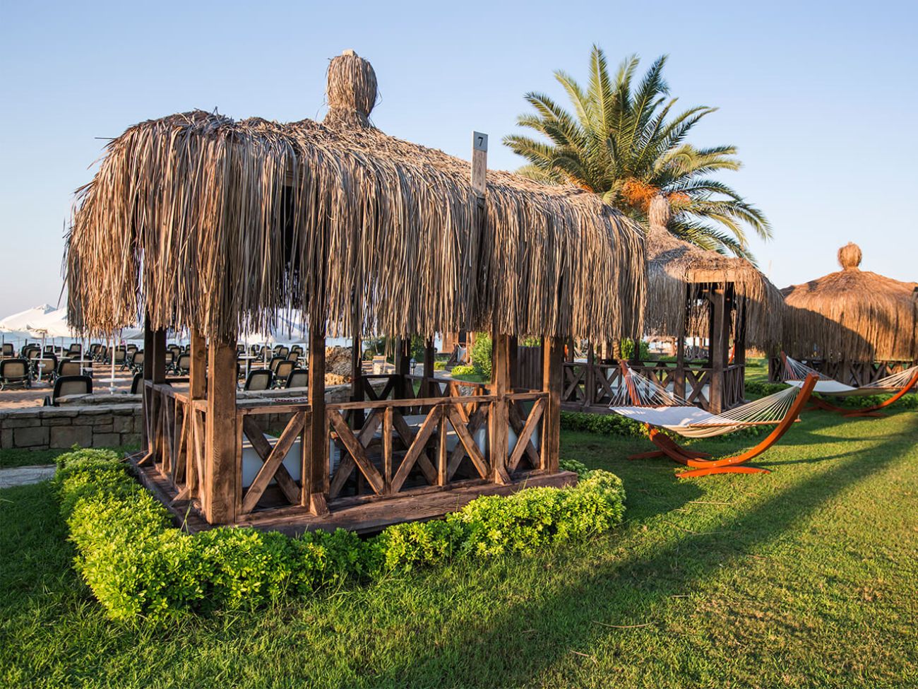 Собствен плаж пясъчно-чакълест. На басейна и на плажа: чадъри, шезлонги, матраци, плажни хавлии - безплатно.