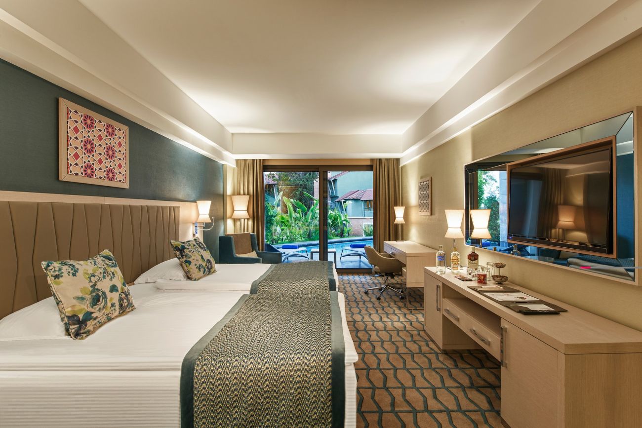 117 Club Standard (изглед градина или басейн - 29 м2), 56 Club Standard Garden Up (изглед градина - 30 м2), 20 Club Family Suite (2 спални със свързваща врата, 2 бани, изглед градина или басейн, 62 м2), 13 Club Family Suite Graden Up (2 спални със свързваща врата, 2 бани, изглед градина - 64 м2 ), 268 Deluxe Standard Room (изглед градина или басейн, 32 - 42 м2), 7 Deluxe Junior Suite (2 спални със свързваща врата, 1 баня, изглед градина или басейн 45 м2), 29 Deluxe Family Room (2 спални със свързваща врата, 2 бани, изглед градина или басейн - 80 м2), 39 Deluxe Standard Swim-Up Room (изглед градина или басейн, директен достъп към общ басейн - 50 м2), 39 Deluxe Swim-Up Suites (2 спални със свързваща врата или разположени на два етажа, 2 бани, изглед градина или басейн, директен достъп към общ басейн, 50-64 м2), 1 Pasha Suite (изглед градина или басейн - 80 м2), 2 King Suite (2 спални със свързваща врата или разположени на два етажа, 2 бани, изглед градина, басейн или море - 120 м2).