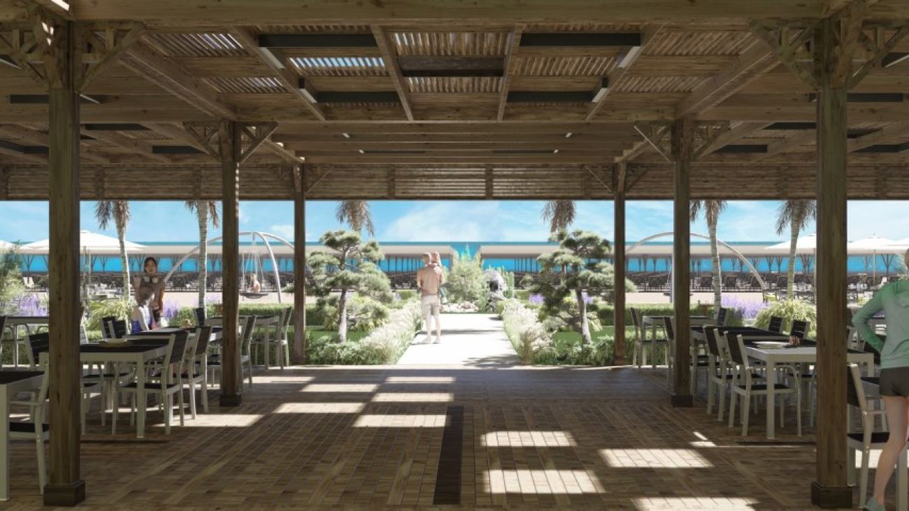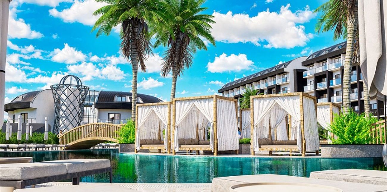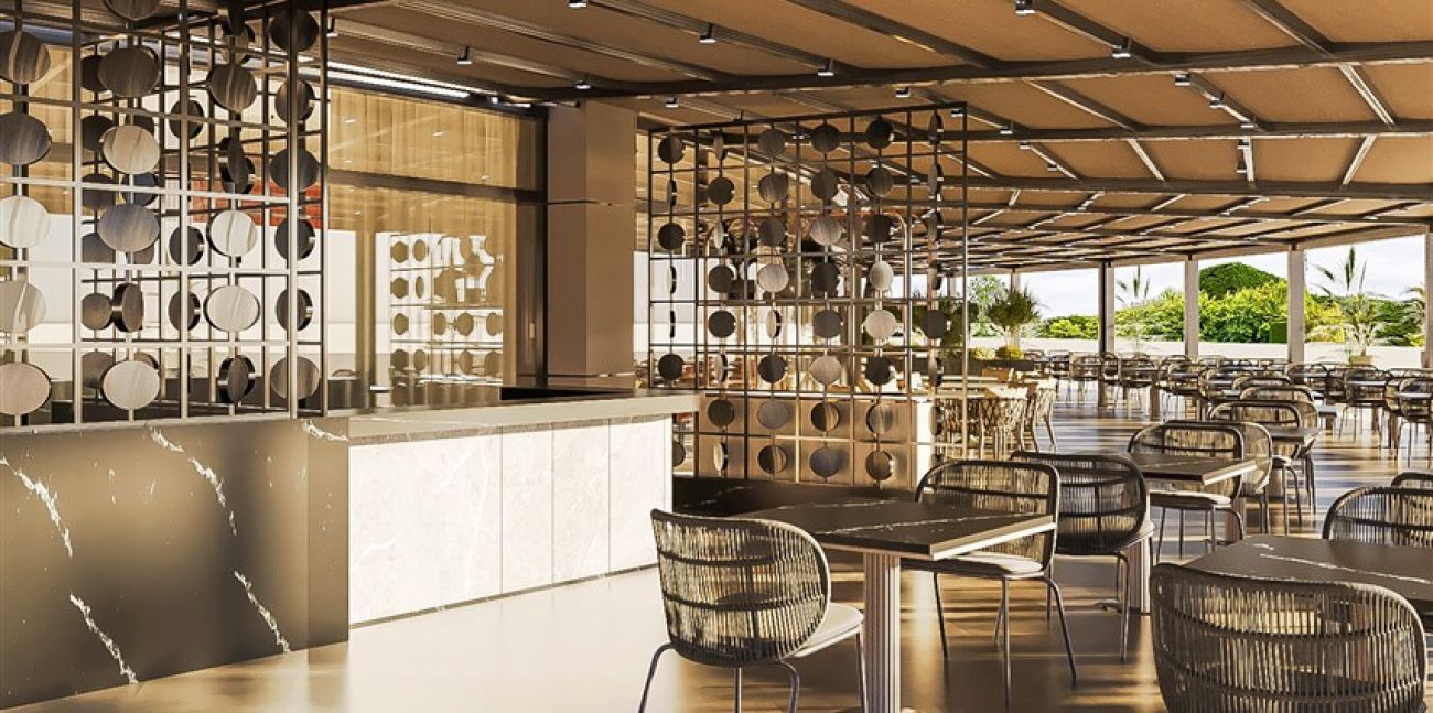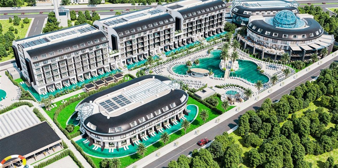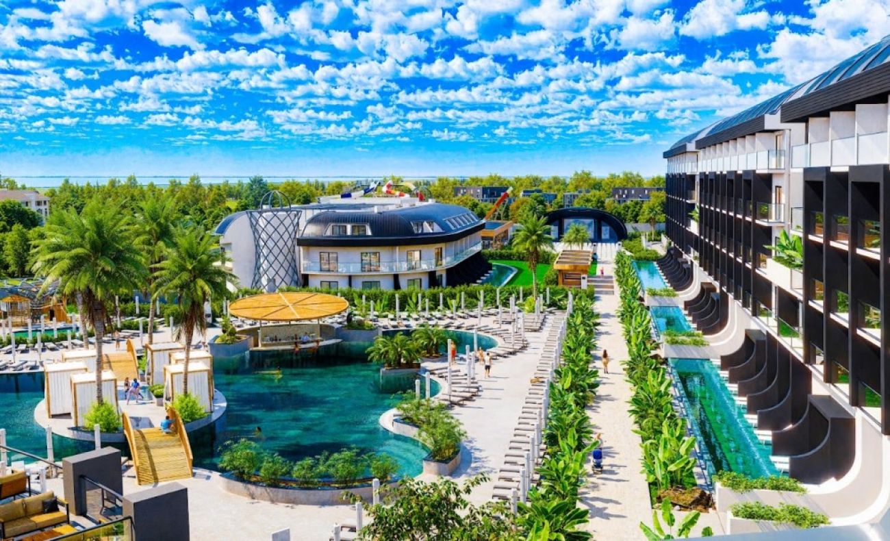 Модерният хотел се състои от основна сграда на четири до шест етажа и островна сграда на три етажа. Разнообразните хотелски съоръжения включват елегантно лоби с места за сядане, рецепция и лоби бар, бюфет-ресторант с тераса, различни а-ла-карт ресторанти (от 1 май, според наличността и резервация за минимален престой от седем нощувки, включително и от включени 14 нощувки втори път), 24-часов снек ресторант, няколко бара, дискотека, закрит плувен басейн (сезонен) с отделен детски басейн (отворен сезонно) и сладкарница. Магазини, минимаркет и фризьор срещу заплащане. Wi-Fi е включен в целия хотел и плажната зона. В добре поддържаната градина има сладководен басейн, аквапарк с пет водни пързалки за възрастни и детски аквапарк с три водни пързалки за най-малките (на час от 1 май), слънчева тераса и бар на басейна. Всички вътрешни и външни съоръжения и услуги на хотела са отворени само в зависимост от метеорологичните условия, наличността и по преценка на хотелиера.
