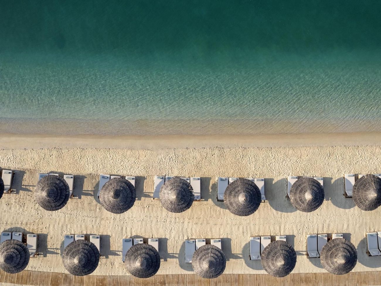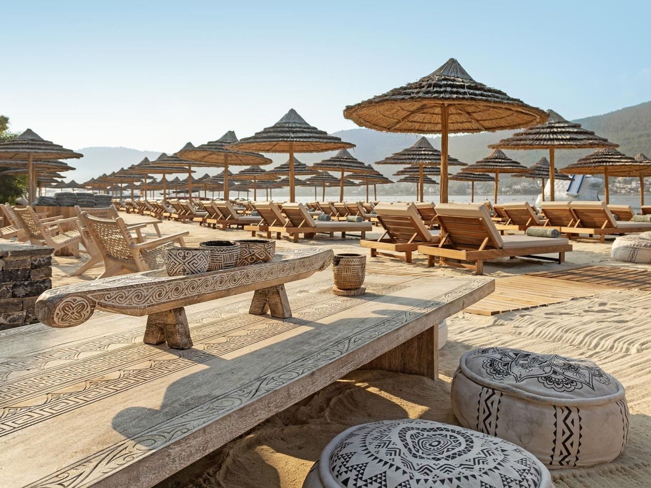 Собствен пясъчен плаж с бял пясък и дължина от 350 м, притежател на "Син флаг" - чадъри и шезлонги на плажа и при басейна безплатно, плажни кърпи - безплатно.