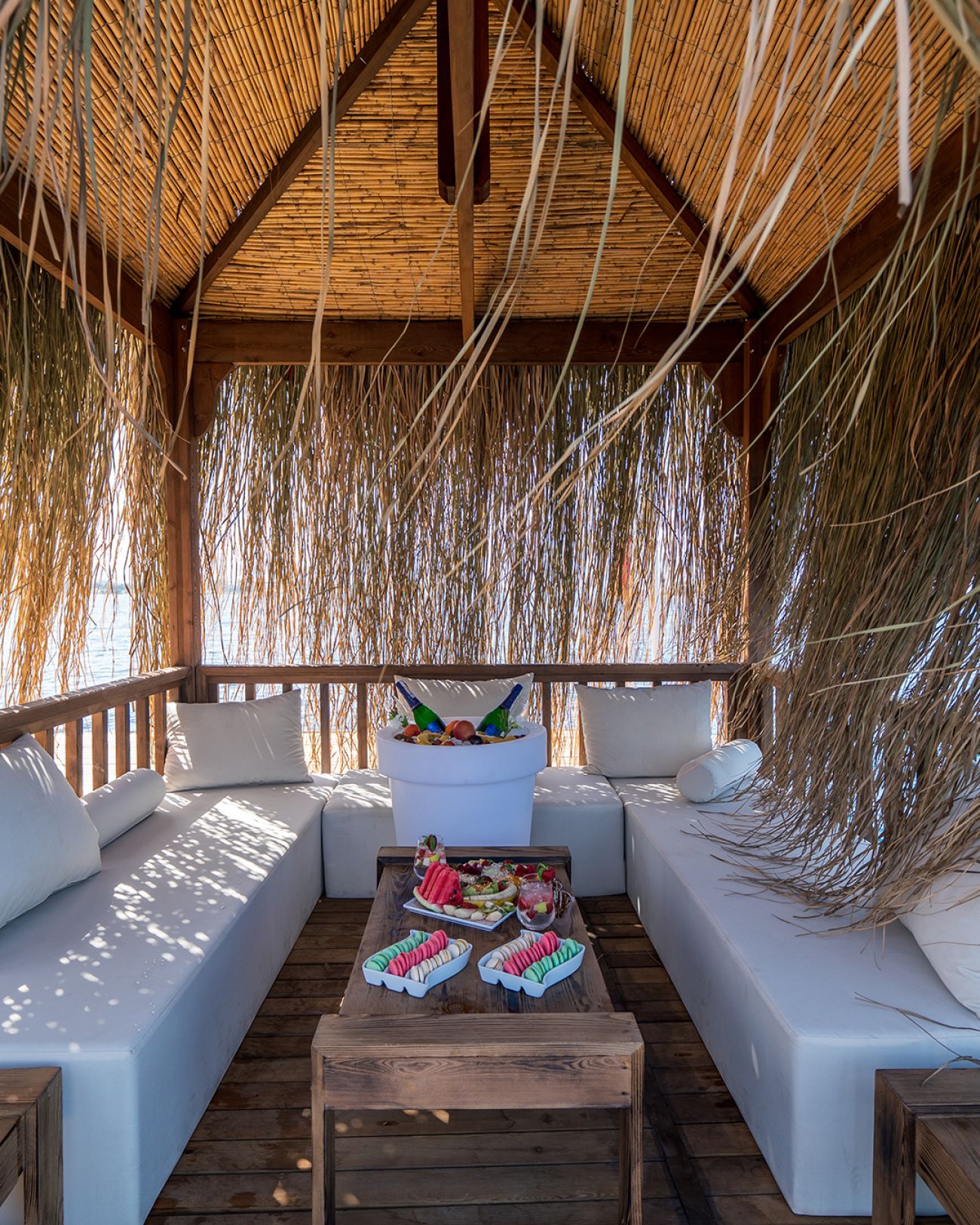 Собствен пясъчно- чакълест плаж с дължина от 700 м, и 3 платформи - чадъри, шезлонги и кърпи на плажа и при басейна - безплатно. VIP кабани на плажа срещу доп. заплащане и с предварителна резервация.