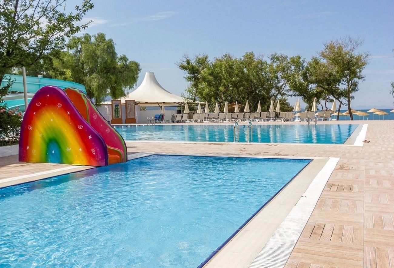 Детски басейн, водни пързалки, детска площадка, мини клуб (4–12 г.).