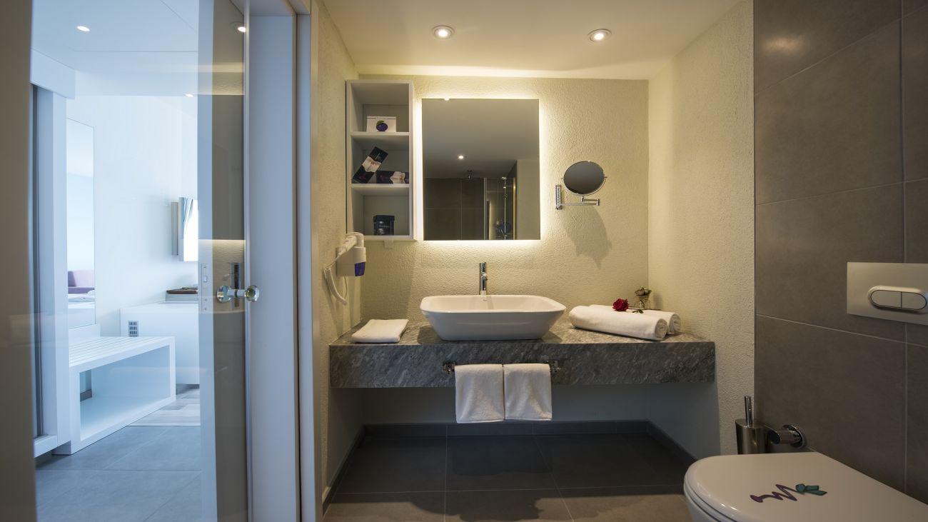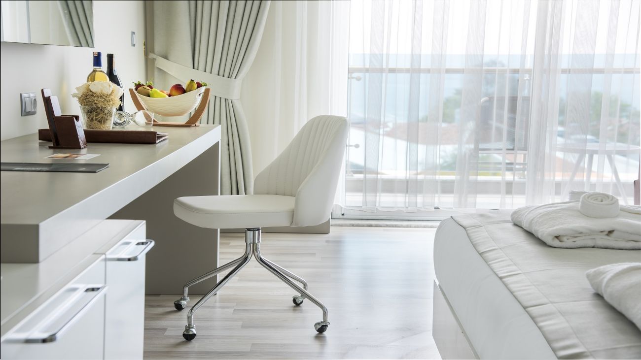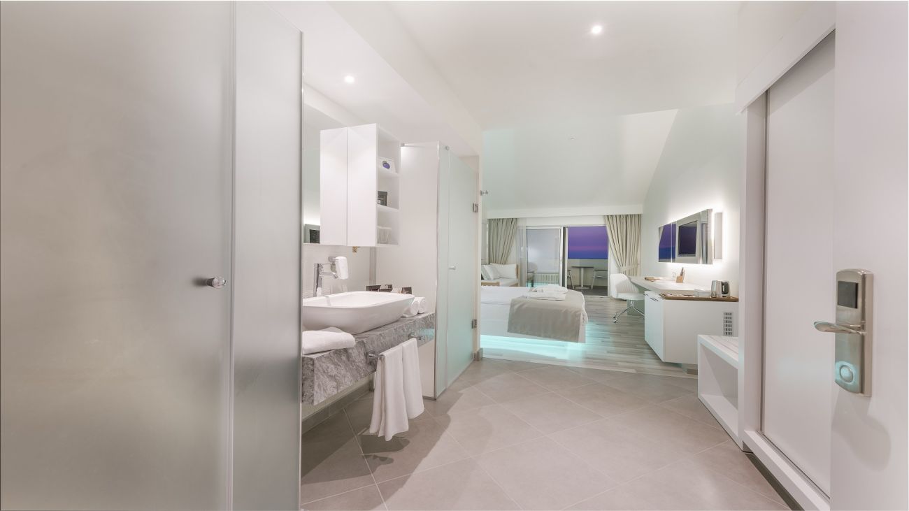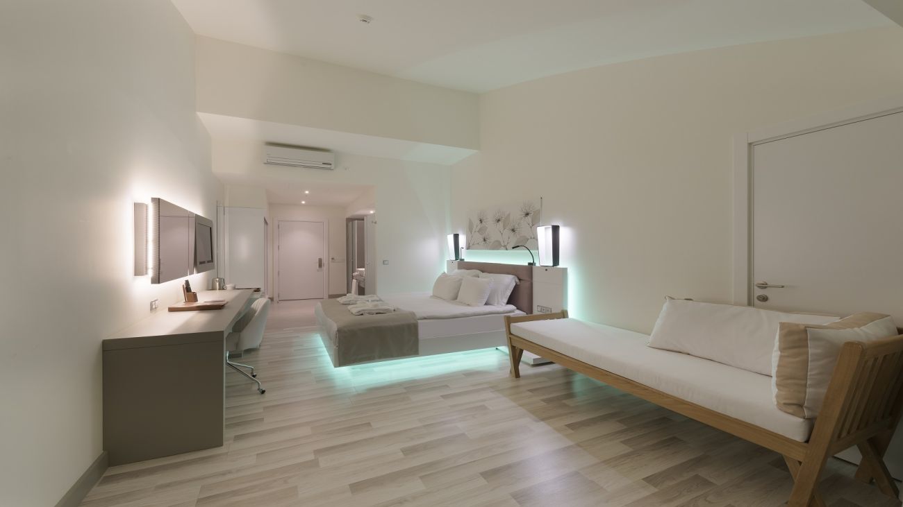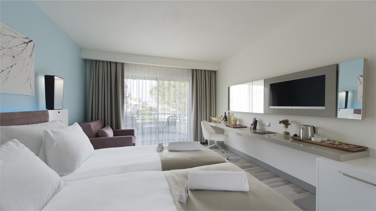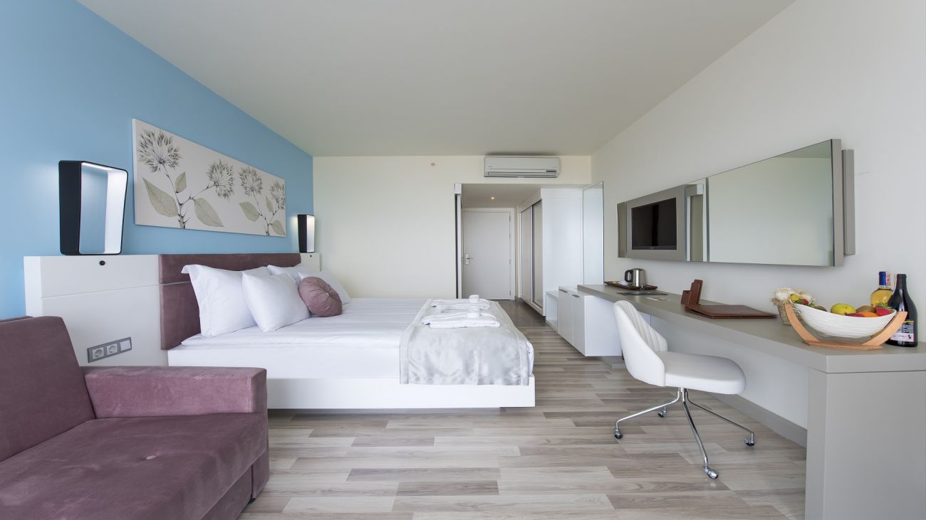 Хотелът разполага с 240 стаи, разпределени в 2 сгради. В основната сграда са разположени: 49 Deluxe room land view (29-32 кв.м); 21 Deluxe room sea view (29-32 кв.м); 7 Deluxe superior sea view room (32 кв.м, разполага с голяма тераса с кът за отдих); 16 Swim up room (23 кв.м, cтаите са с директен достъп до басейна. В този тип стаи не се допуска настаняване на деца.); 2 Disabled Room; 43 Family suite side sea view (38-45 кв.м /1 стая със спалня, 1 стая с единични легла, 1 баня); 12 Family suite land view (38-45 кв.м /1 стая със спалня, 1 стая с единични легла, 1 баня); 4 Penthouse Suite (50-90 кв. м.) В допълнителната сграда са разположени: 82 Standard Land View Room (23 кв.м); 1 Senior Suite (50-90 кв. м.). Всички стаи са оборудвани с климатик, телевизор, телефон, баня с душ, сешоар, сет за чай/кафе, минибар (платен), сейф (безплатно), балкон, Wi-Fi интернет (безплатно). Почистване на стаите - всеки ден, смяната на спалното бельо и кърпите - 3 пъти в седмицата.