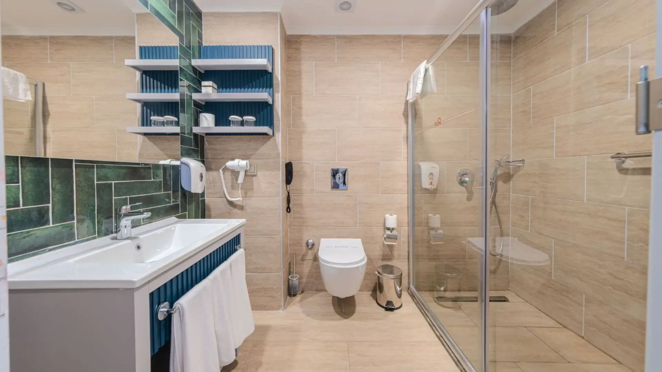 Двойни Стандартни стаи - тип 1 - (3 стаи са обзаведени специално за гости с увреждания), Максимален капацитет: 2+1 – 3 души, Размер на стаите: около 25 м², Ламиниран паркет, система за заключване с електронна карта, централна климатизация (на час) и отопление (в зависимост от сезона), LCD телевизор със сателитна телевизия и музикален канал, мини бар, сейф (наема се срещу заплащане), телефон с директно избиране, Wireless – Интернет (безплатно). Удобства за баня: телефон, сешоар и душ.
