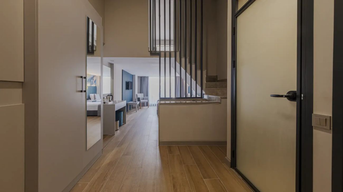 ДУПЛЕКС ФАМИЛНА СТАЯ: Състои се от 2 спални, 1 баня + 1 душ (на горния етаж). Има 1 двойно легло в спалнята на горния етаж и 2 единични легла на приземния етаж. Има свързваща врата в спалнята на горния етаж. Можете да се качите горе по стълбите. Всички останали характеристики са същите като в стандартните стаи.