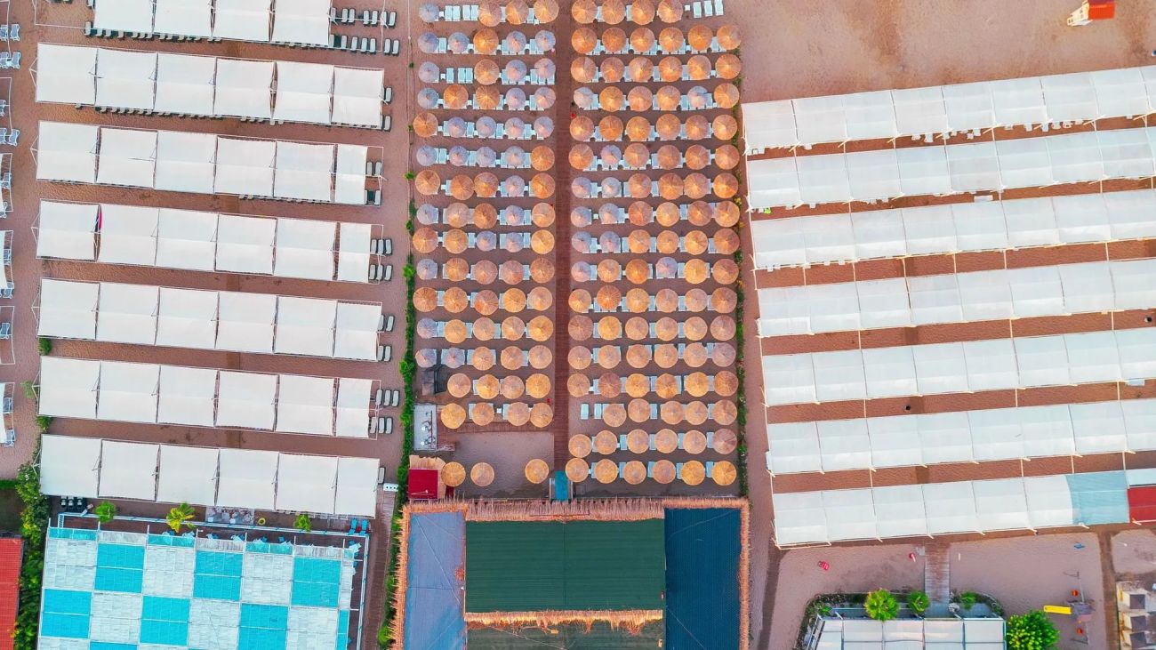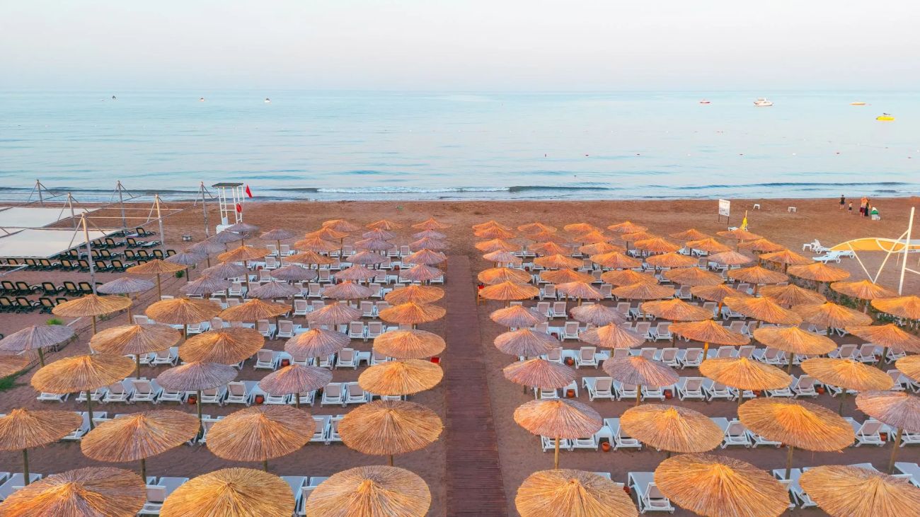 Собствен с фин пясък на около 800 м с осигурен безплатен шатъл до него. Плавен заход към морето. Разполага с бар на плажа и снек бар. Шезлонги, чадъри – безплатни.