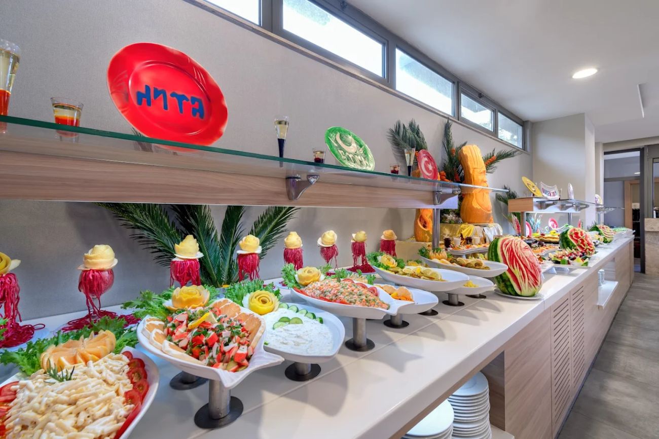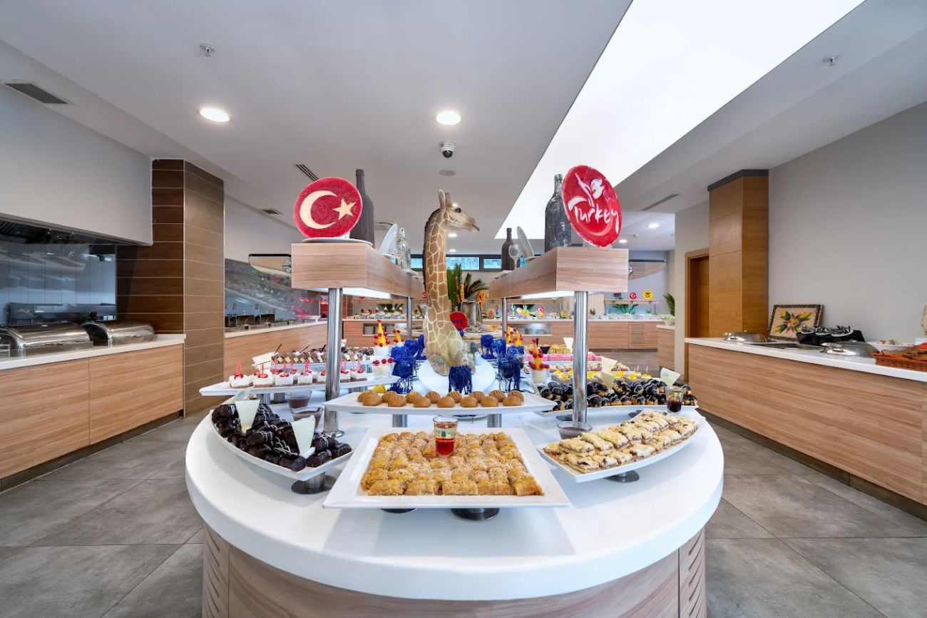 Основен ресторант, барове, открит и закрит басейн, 2 водни пързалки, СПА център, магазини, дискотека, WI-FI(в лоби). За децата: Детски басейн, мини клуб(4-12), детска площадк, мини диско. Безплатни услуги: Сауна, турска баня , парна баня, фитнес, тенис на маса, дартс, билярд, плажен волейбол, аеробика, водна гимнастика, анимация, WI-FI. Платени услуги: Масаж, пилинг, фризьор, химическо чистене, лекар, водни спортове, детегледачка , рент-а кар.