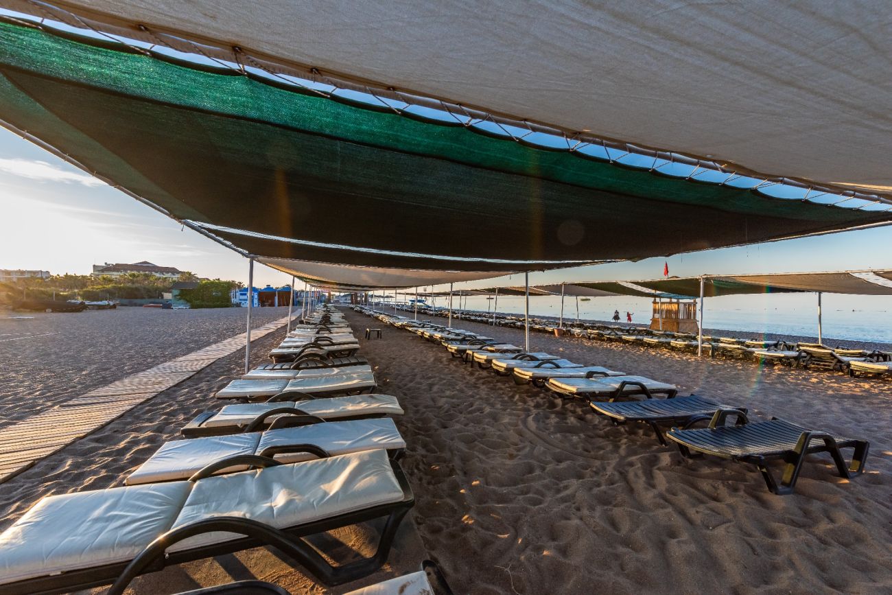 Собствен пясъчен плаж на 200 м. от хотела, чадъри, матраци, шезлонги-безплатно, плажни кърпи-безплатно, бар на плажа.