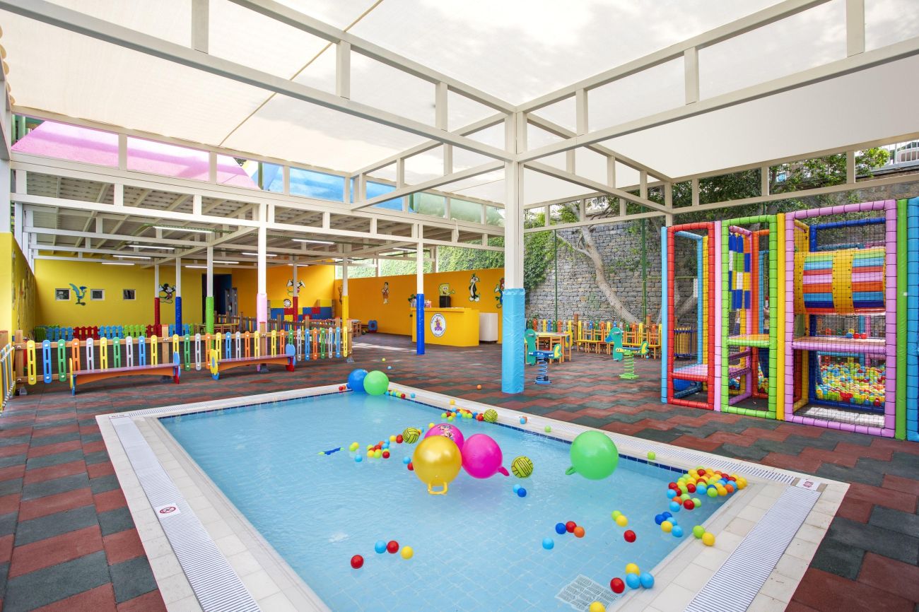 Анимация, детско меню, външен и вътрешен детски басейн, водни пързалки, детска площадка, мини клуб (4–12 г.).