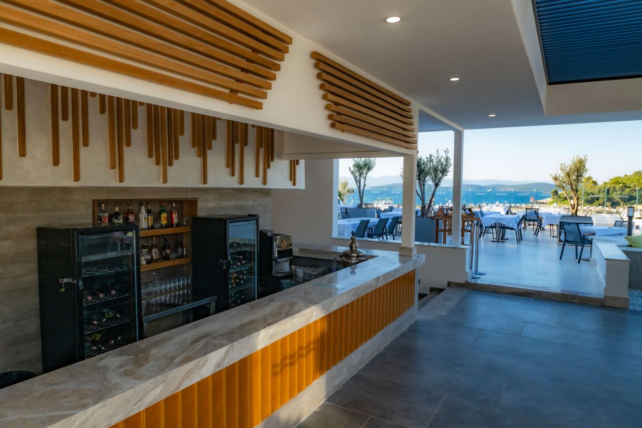 Собствен пясъчен плаж с дължина от 150 м и 150 м платформа - чадъри, шезлонги и кърпи на плажа и при басейна - безплатно.