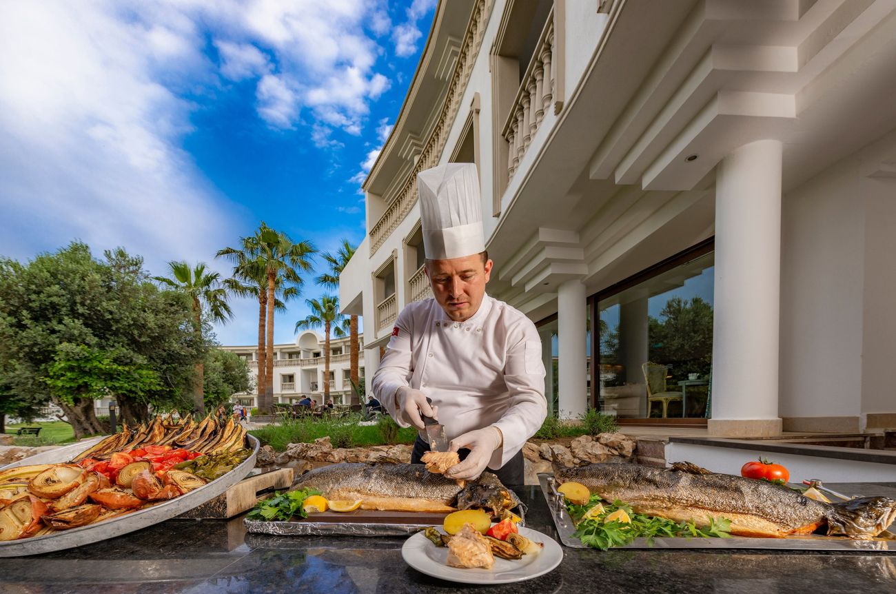 Хотелът разполага с основен ресторант Karya, два а-ла-карт ресторантa (турски Begonvil и рибен Teras Seafood - с предварителна резервация, едно безплатно посещение за престой от минимум три нощувки), 6 бара - Palm Bar, Roof Bar, Pool Bar, Sea Bar, Snack Bar и Olive Bar.