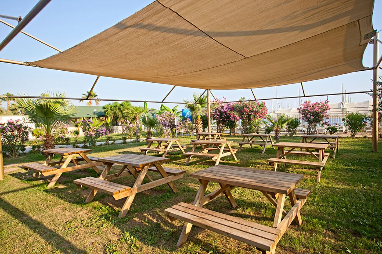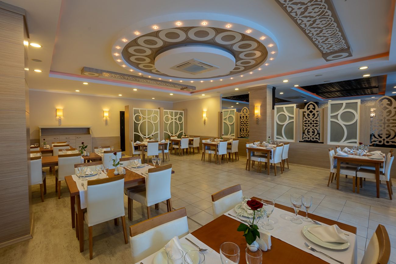 На територията на хотела се намират основния ресторант " GAIA ", плажен снек-бар, Okyanus бар, Tethys á la carte ( морска кухня ), Themis á la carte ( турска кухня ), диско бар " Theia ", открит басейн, закрит басейн.