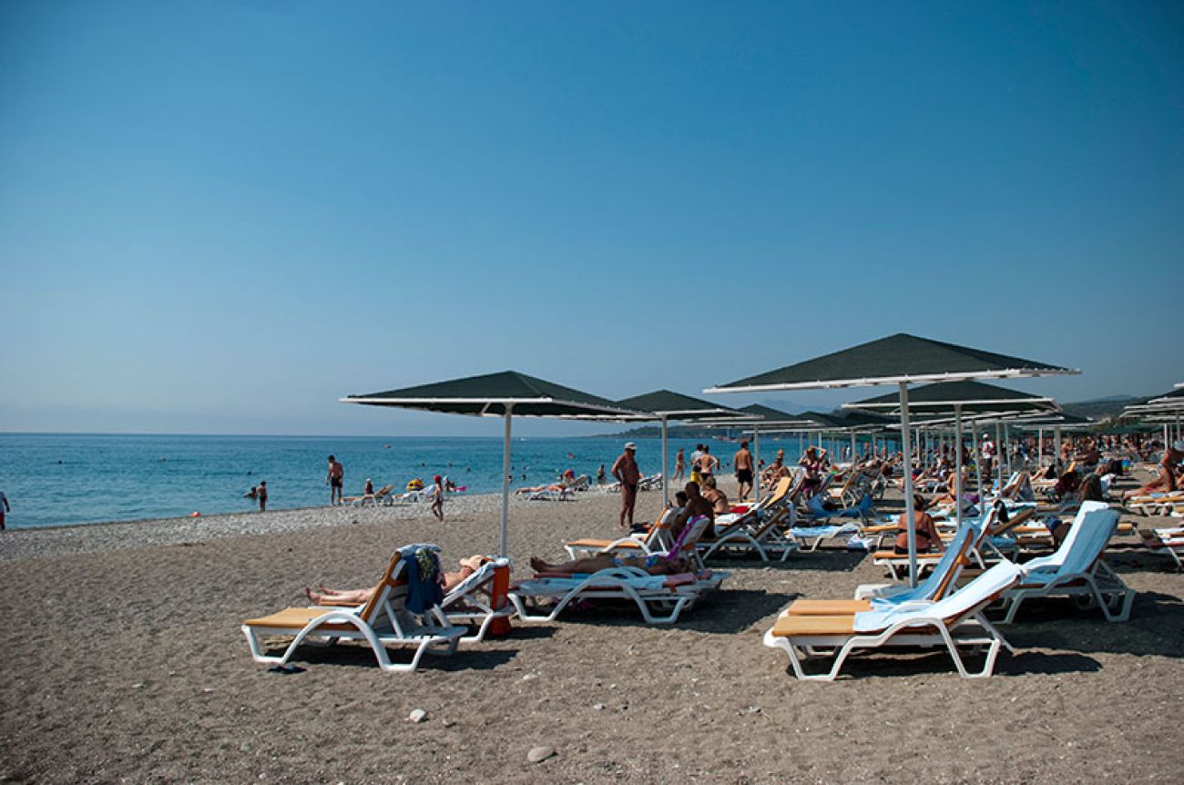 Собствен пясъчно-чакълест плаж. Beach Bar - безплатен ( безалкохолни напитки ). На басейна и на плажа: чадъри, шезлонги, матраци - безплатно. Плажни кърпи - срещу депозит.