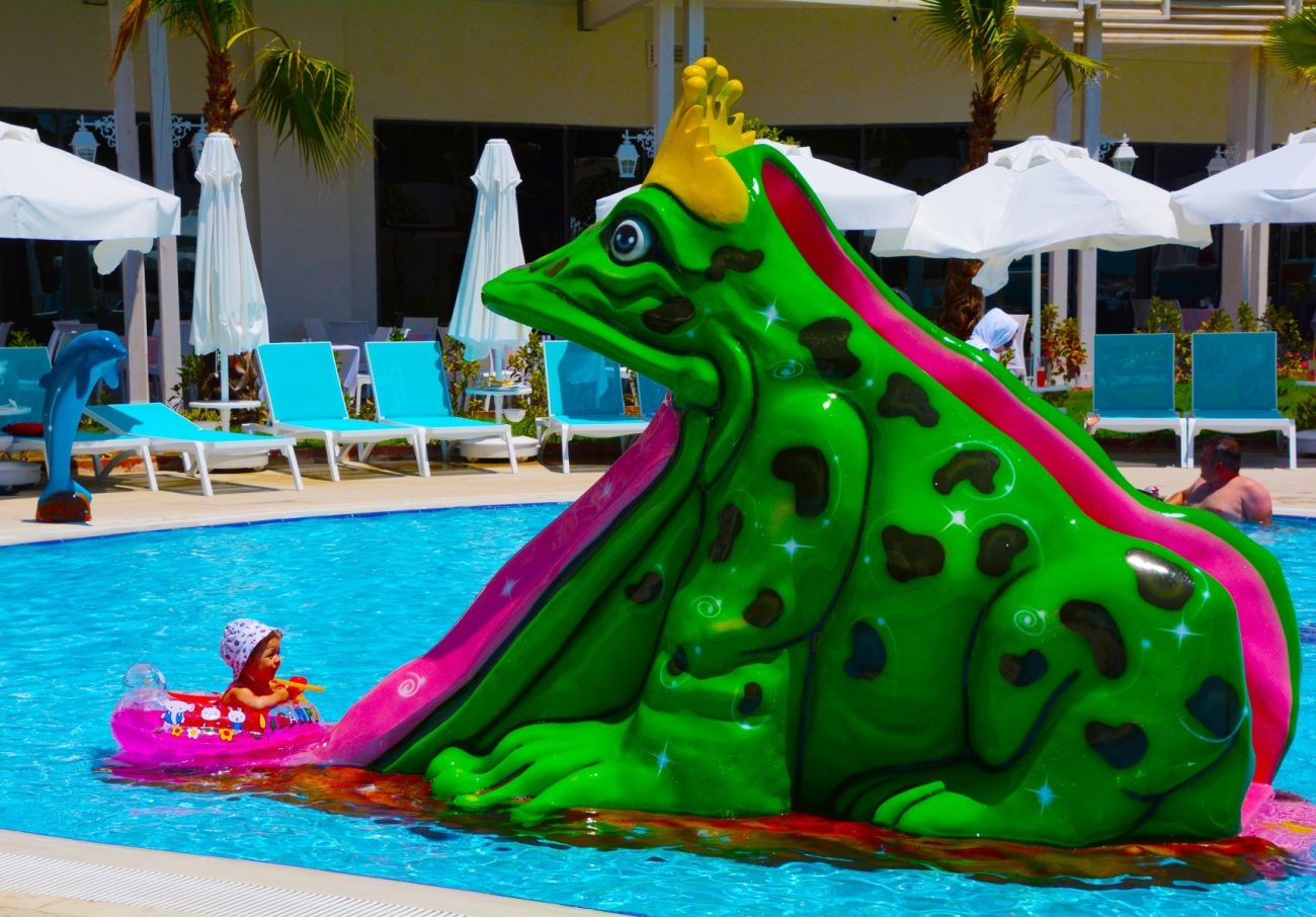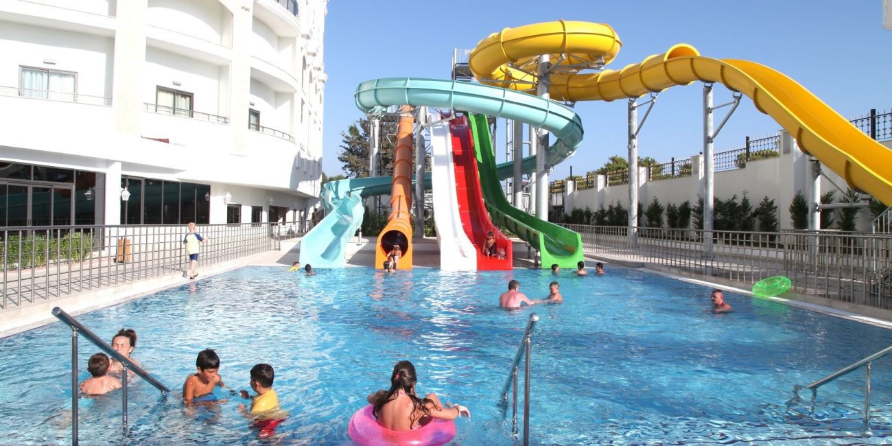 Открит и закрит басейн, водни пързалки, анимация, мини клуб (4-12), мини диско.