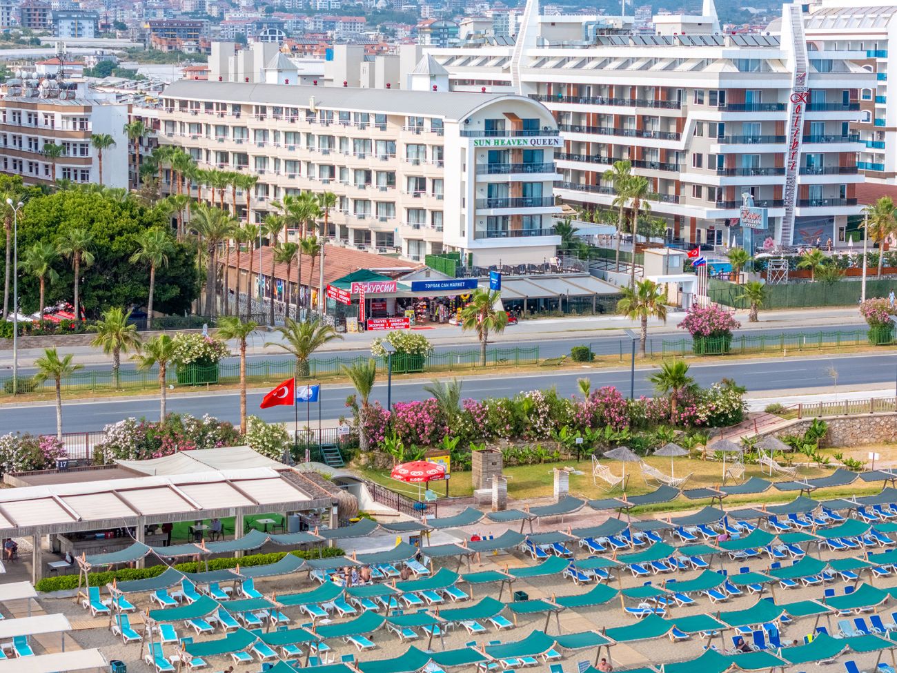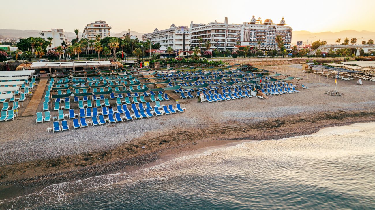 Собствен пясъчно-чакълест плаж. Бар на плажа-безплатен.На плажа и на басейна: чадъри, шезлонги, матраци – безплатно. Плажни хавлии: няма.