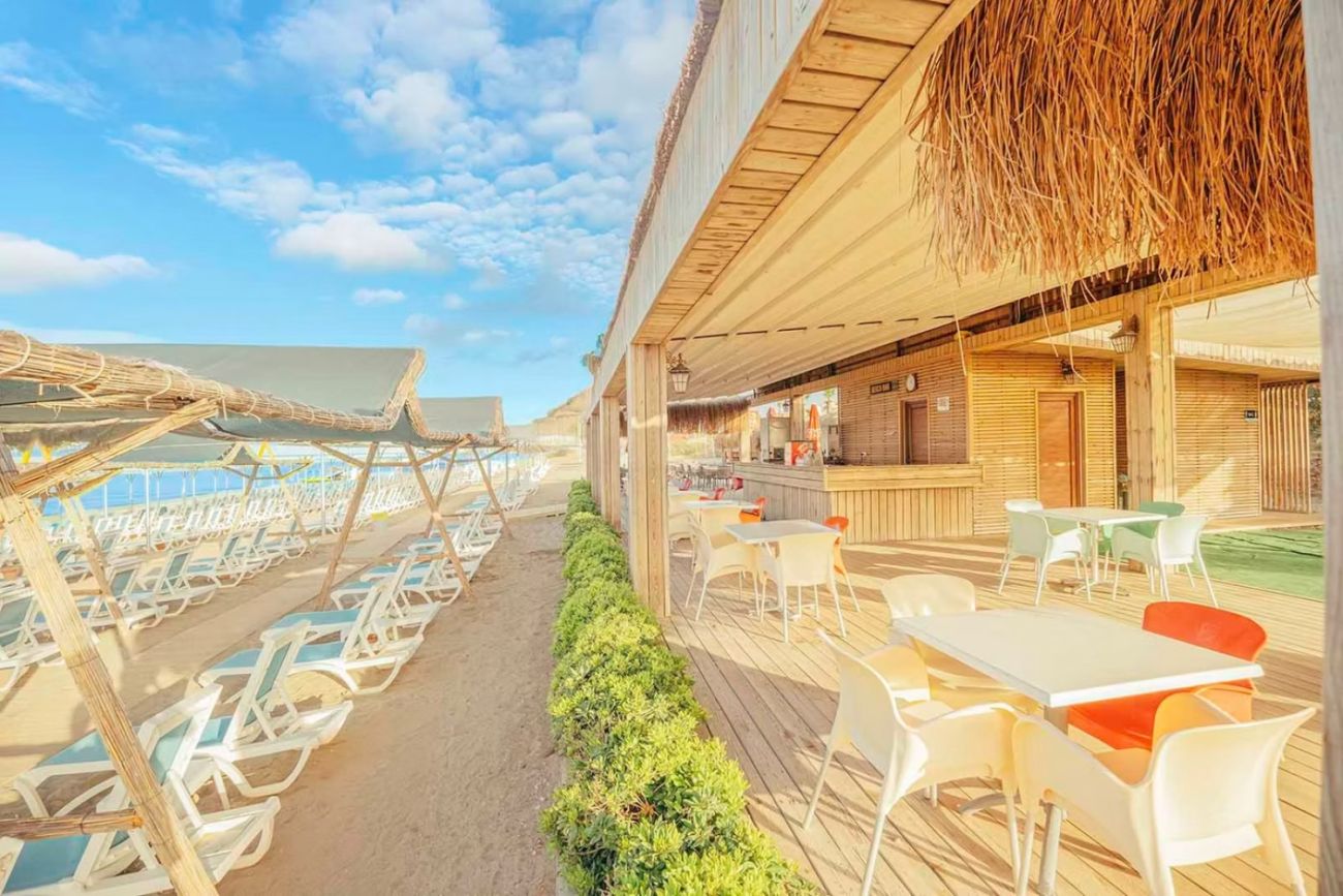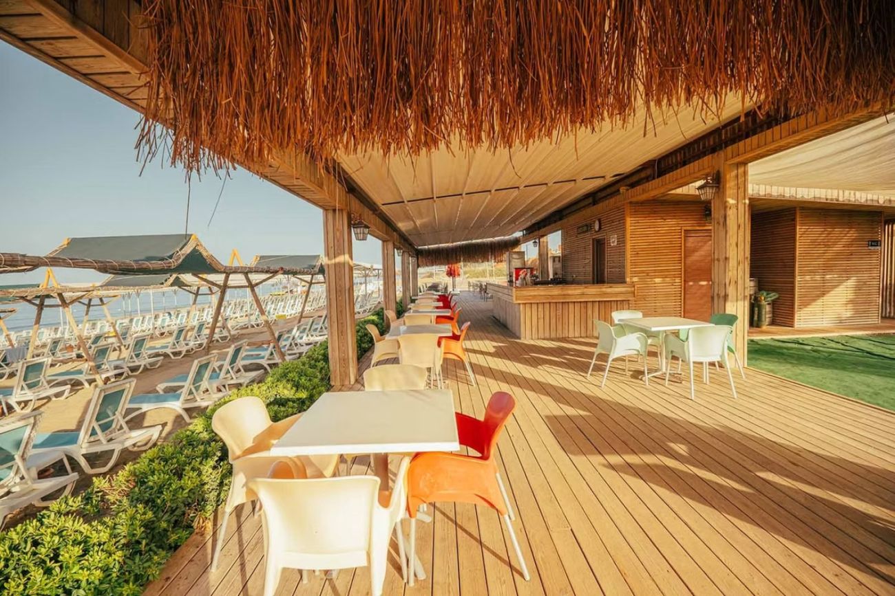 Собственият пясъчно-чакълест плаж е на 50 м от хотела, през пътя.